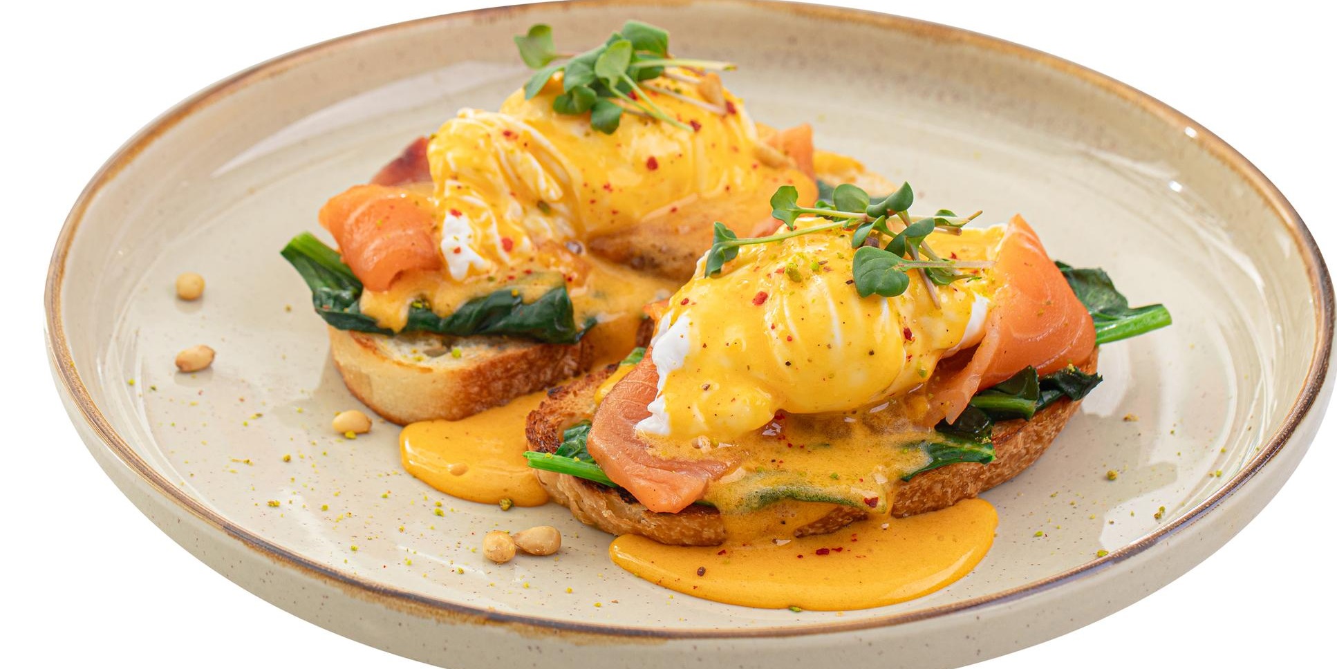 Poached egg, smoked salmon, avocado and hollandaise sauce on an English muffin