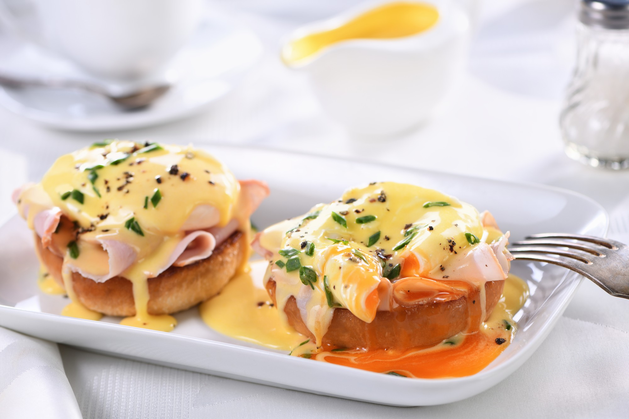 Poached egg, ham, avocado and hollandaise sauce on an English muffin