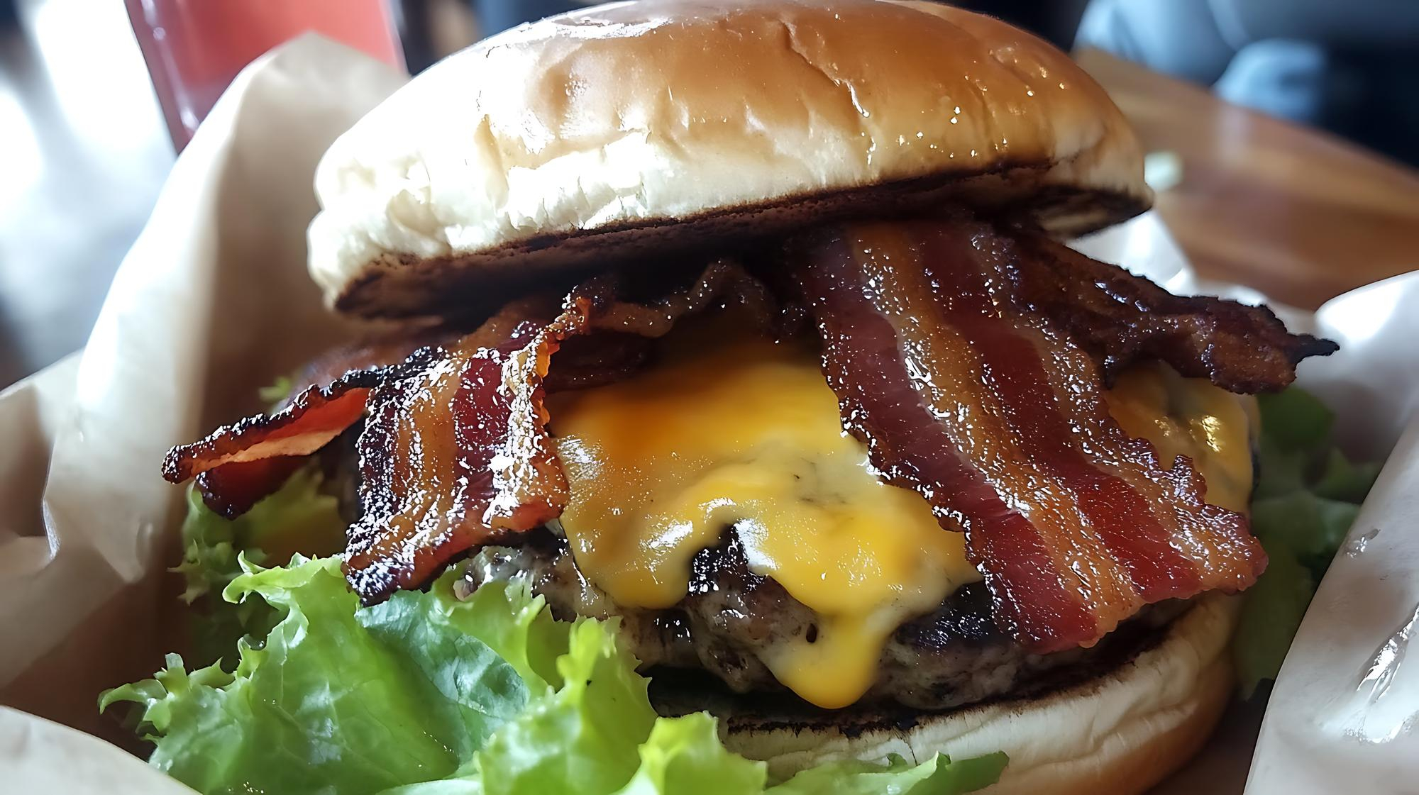 Chuck/brisket/short rib patty, bacon, lettuce, tomatoes and cheese on a brioche bun