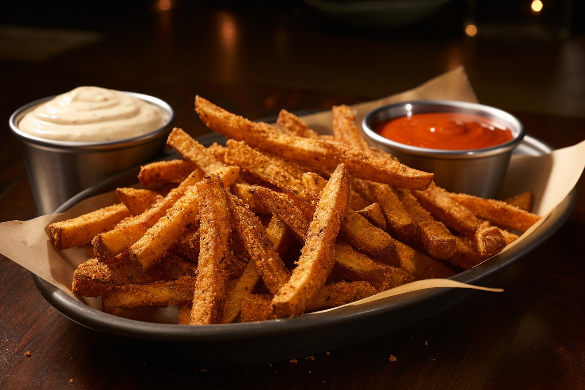 Cajun-battered cod served with seasoned fries and a side of tartar sauce.