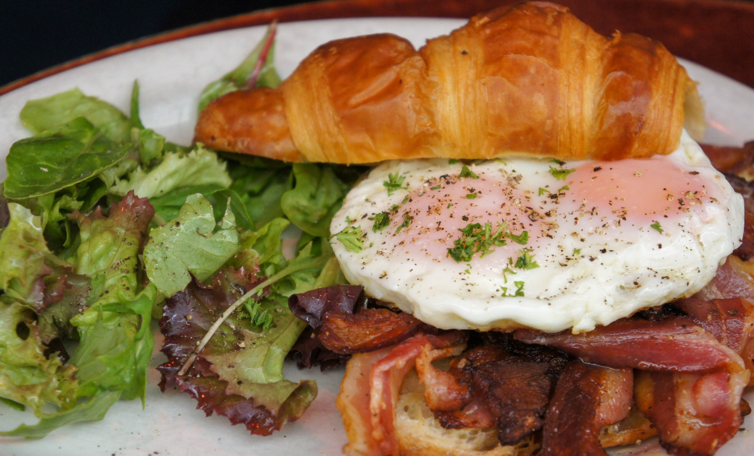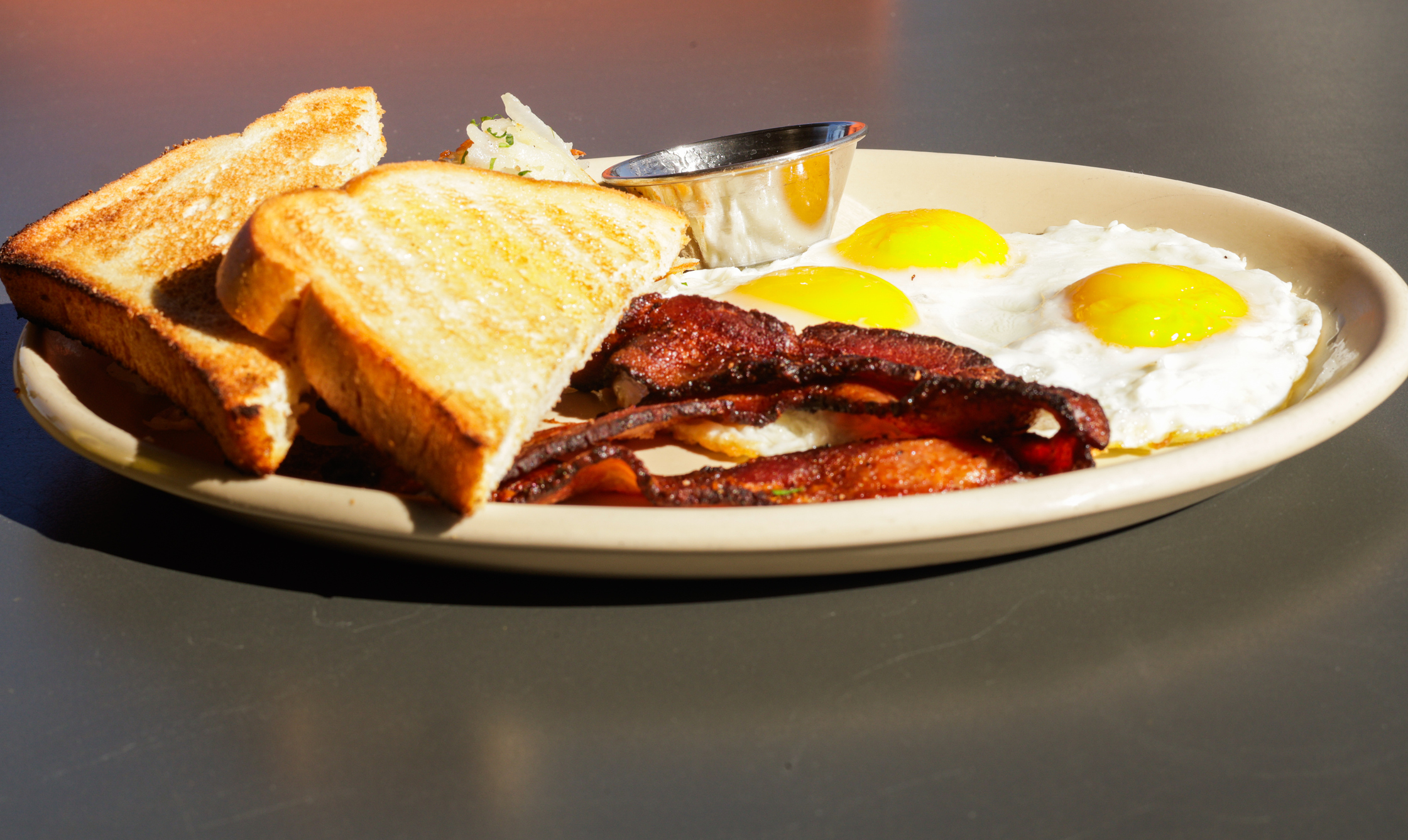 2 fried eggs with a choice of sausage/vegan sausage or bacon, cheese toast/toast and tator tots.