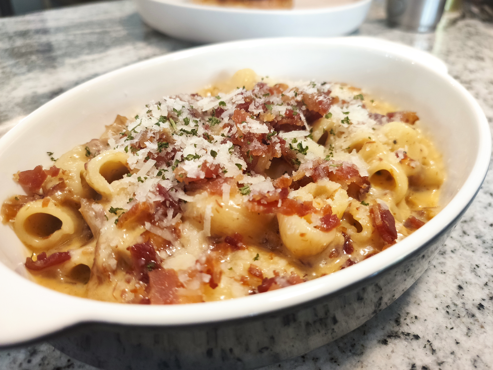 Creamy mac N cheese top with a fried egg and bacon crumbles