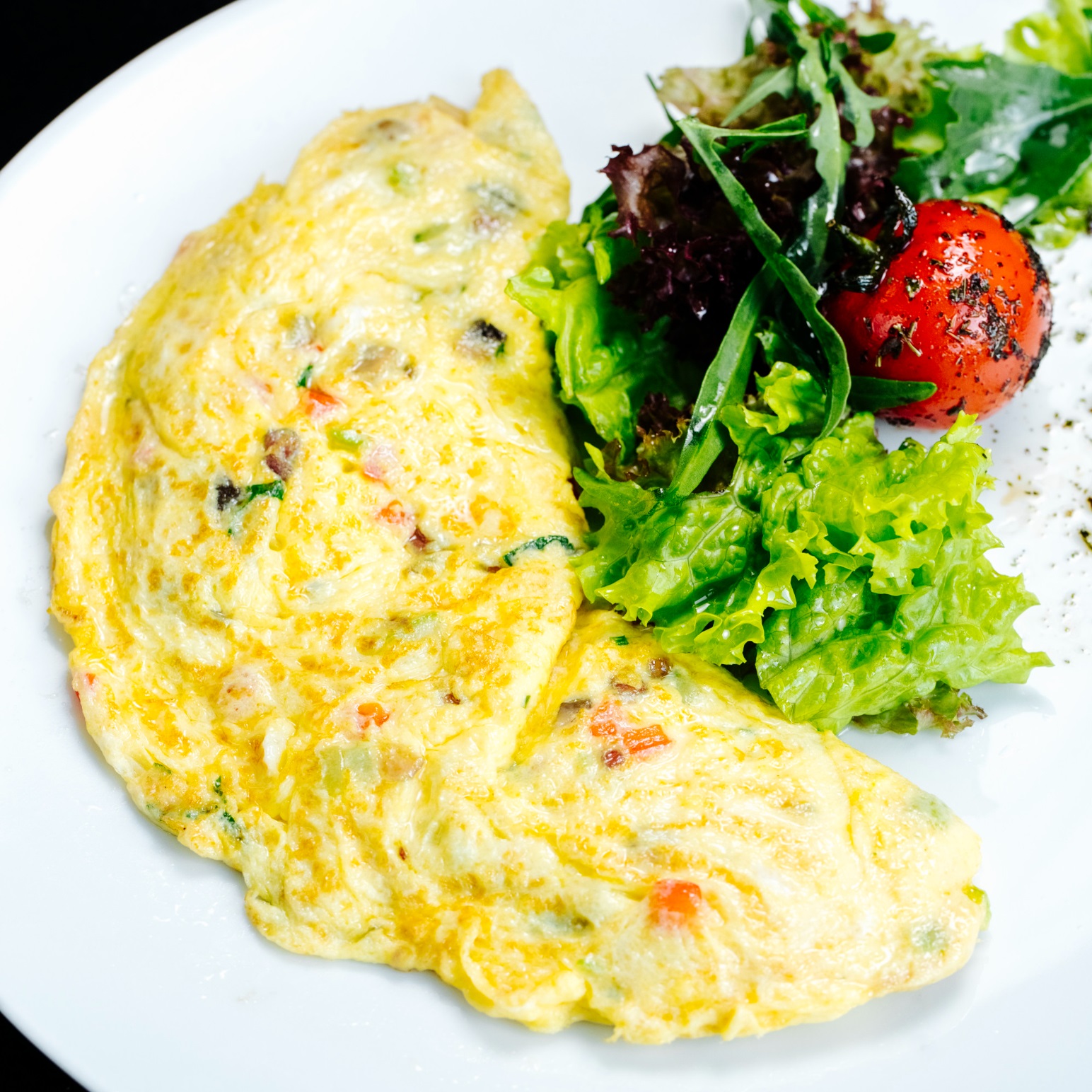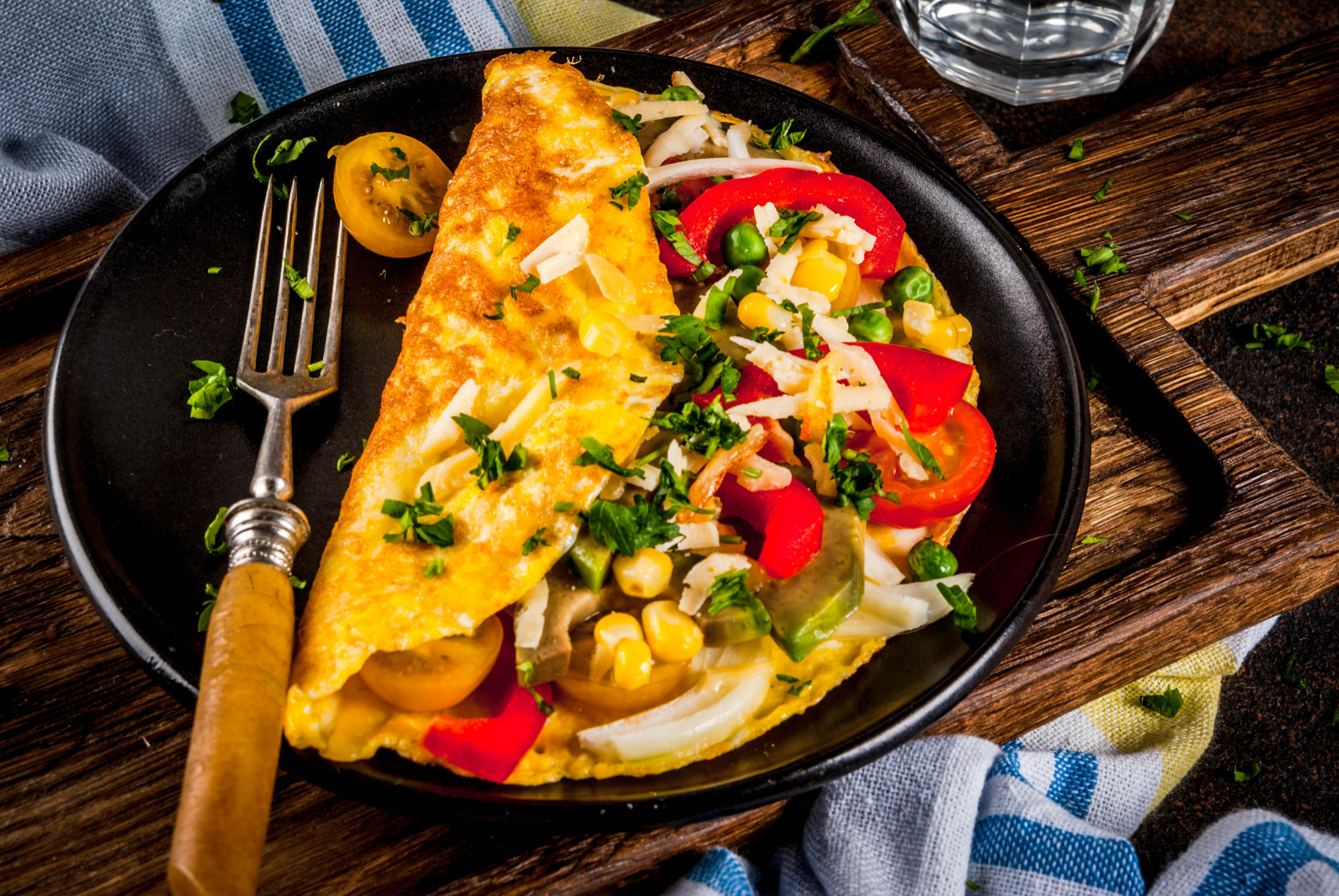 3 Eggs with bell peppers, onions, tomatoes, jalapenos, cheese, ham, bacon with toast and tater tots